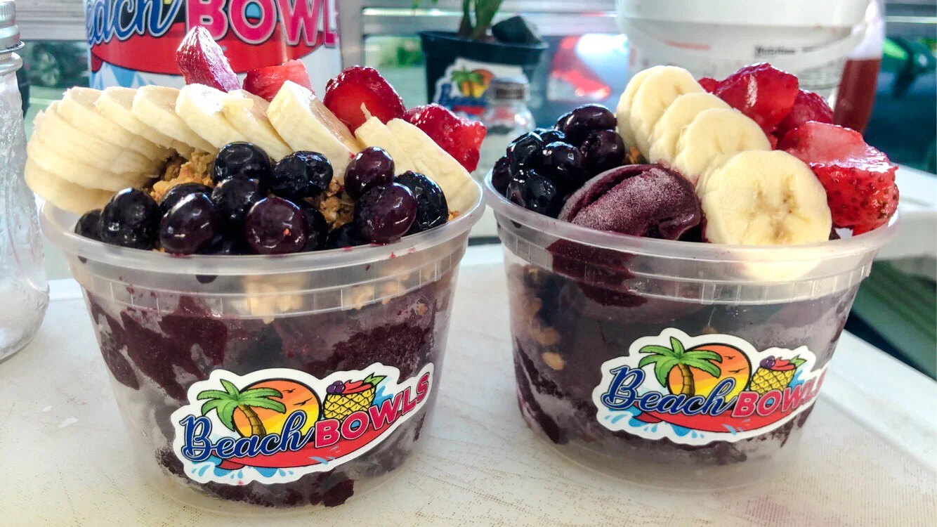 Açaí with Pineapple, Strawberries, Coconut Flakes, Granola, and Peanut Butter.